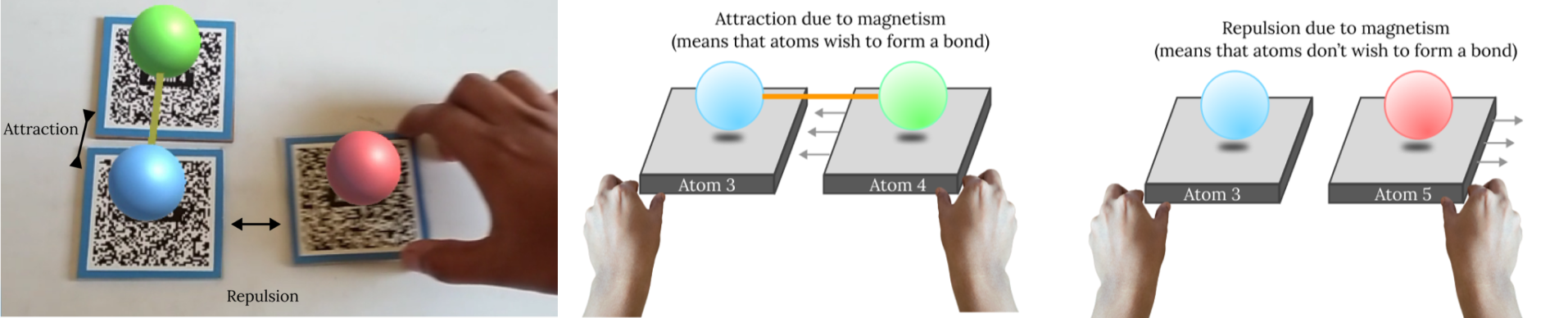 are two other markers which have Red and Green atoms. When the blue atom marker is brought closer to the green atom marker the